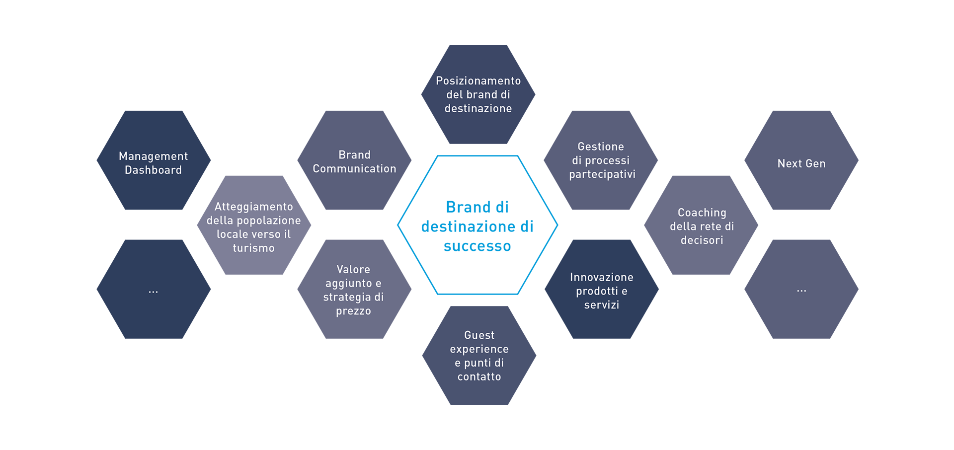 Una visione strategica chiara deve includere diverse dimensioni. Oltre a un posizionamento solido e orientato al futuro del marchio della destinazione, i fattori per diventare una destinazione per tutto l’anno, l’innovazione delle prestazioni chiave, la costruzione di una forte value proposition, nuovi modelli di business e di pricing, nonché la creazione di una guest experience distintiva. Non ci limitiamo a sviluppare strategie di destinazione, ma accompagniamo attivamente anche il processo di implementazione.